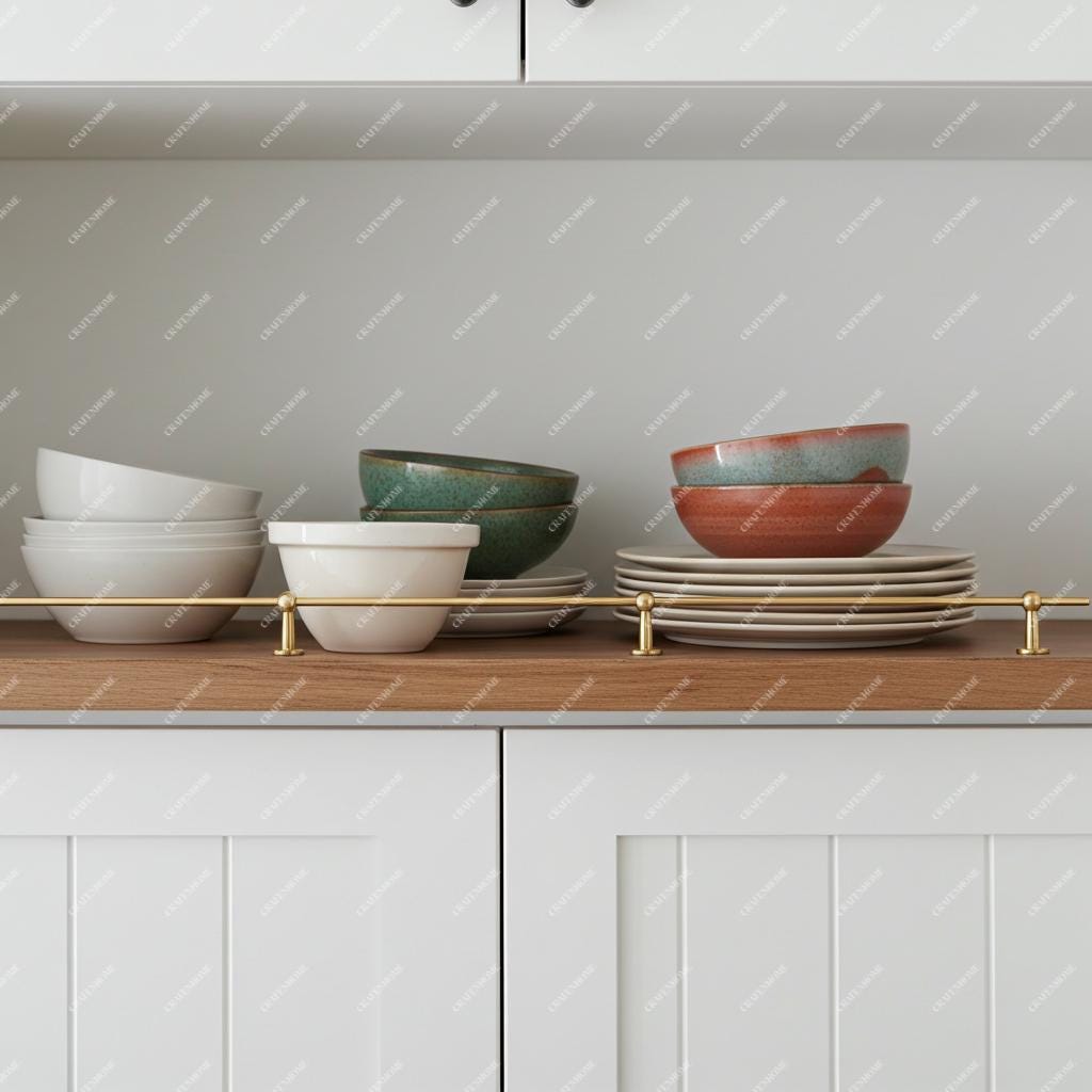 Unlacquered brass gallery rail brings timeless elegance and functionality to kitchen cabinets and open shelving. Perfect for classic and modern interiors—order today.